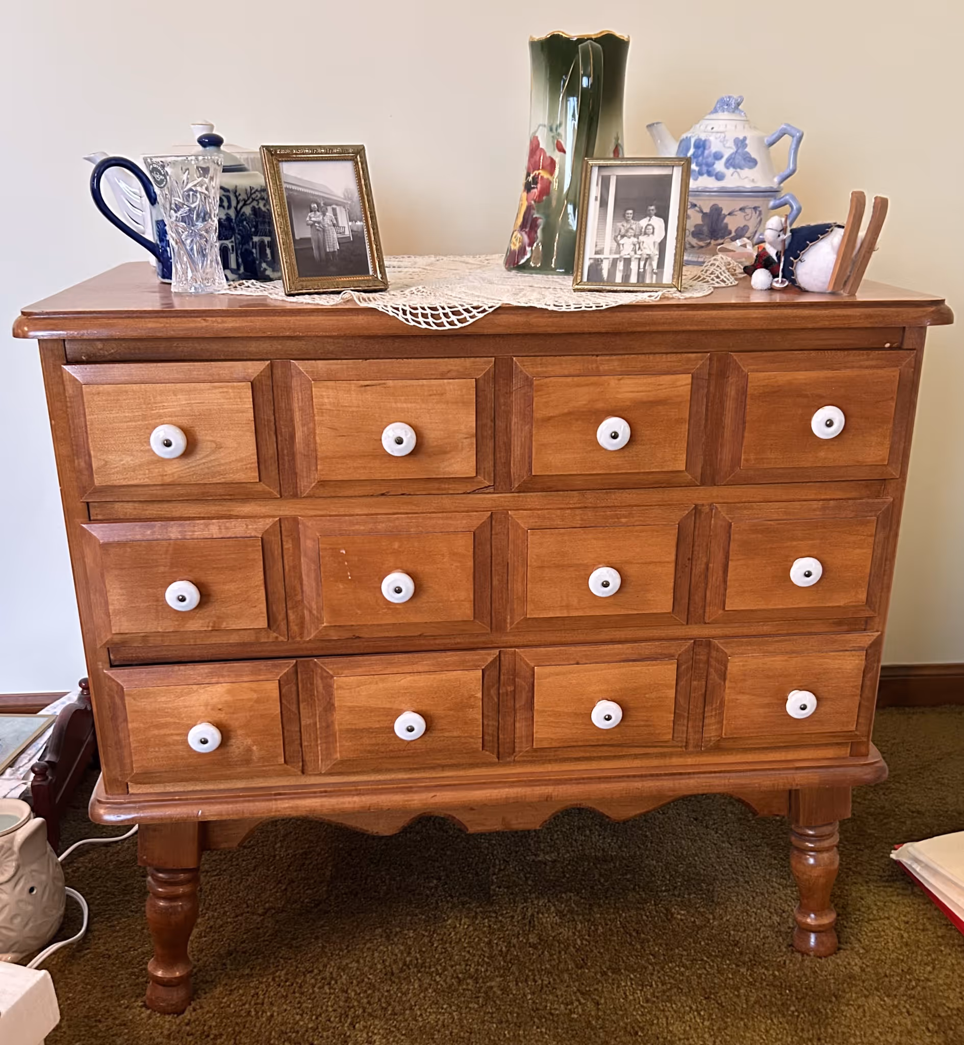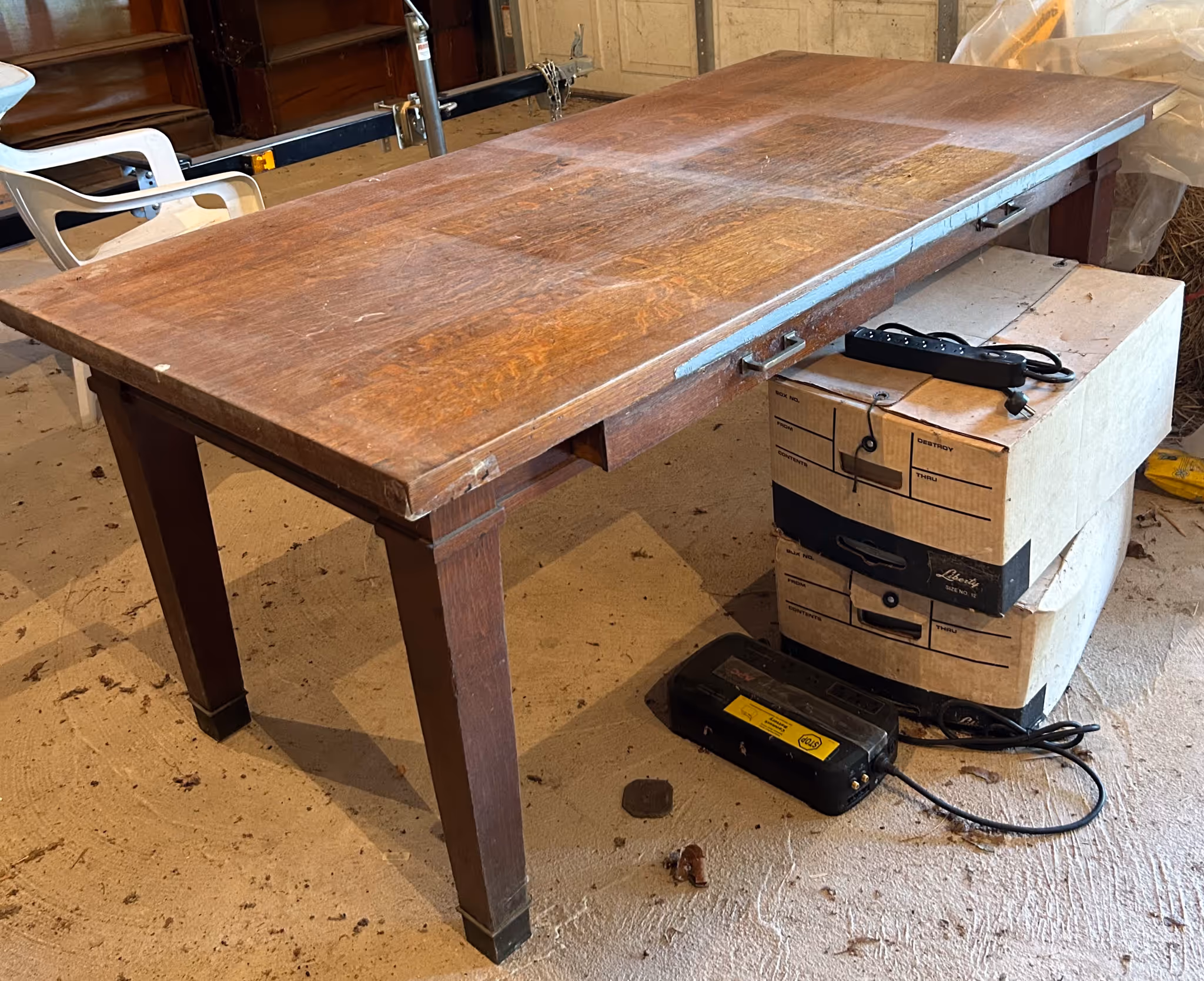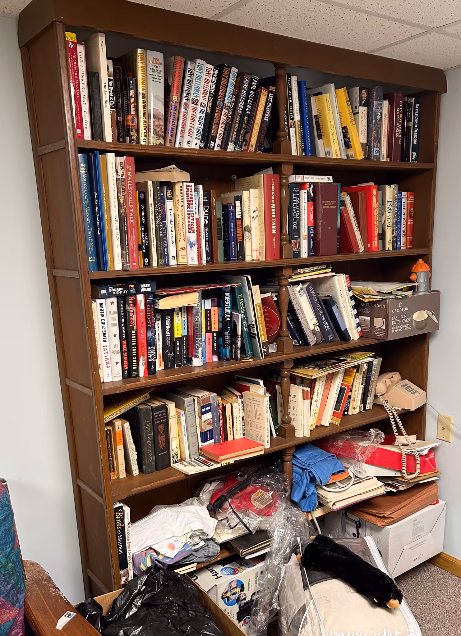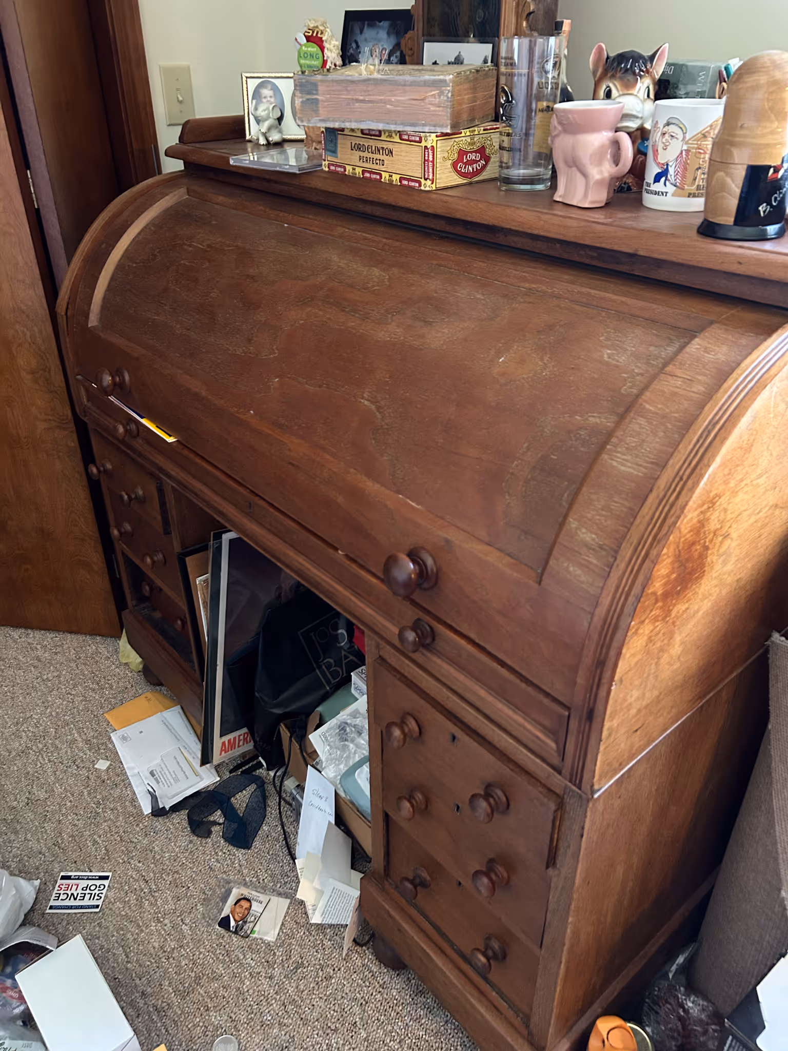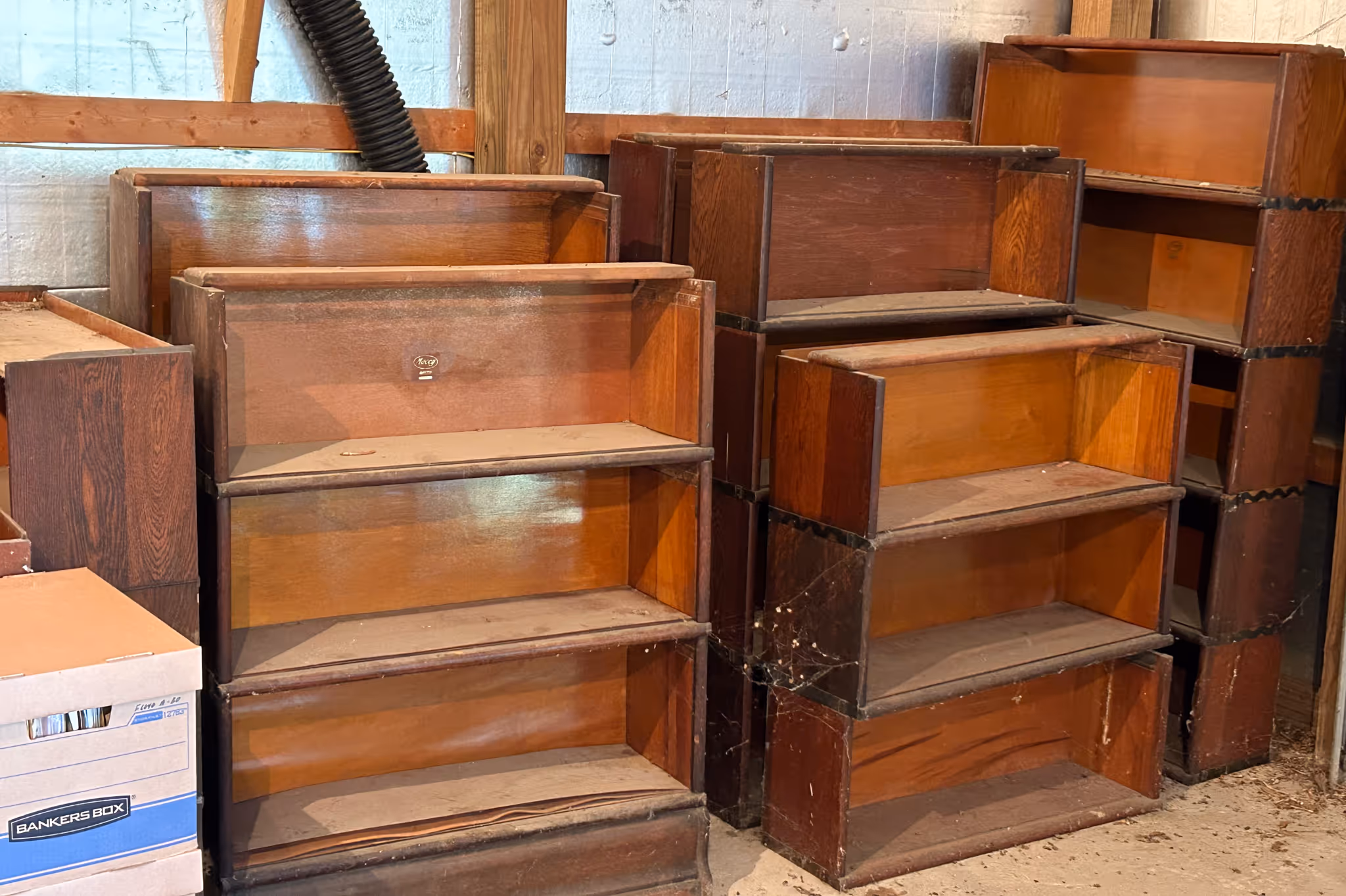 ANTIQUE FURNITUE, LAWYERS BOOKCASES: Selection of oak lawyers’ bookcases, doors are removed in photos but many are present, (not all photo’d sell!) * 8ft Conference table from old Paris Savings Bank * 5 Old Captain’s chairs * Oak Conference table from Mr. Lawson’s law practice * Nice oak original curved glass china cabinet w/ Lion heads & full column front, claw footed *J.P. Coates 2 dr spool cabinet * 45 Drawer file system cabinet * Walnut rolltop desk, birds eye maple drawers * MT Walnut dresser * Square oak 5 leg dining table * Set of 6 Victorian walnut chairs w/ cane seats * Oak hall mirror hat rack* Camel top trunk * Birdseye maple sewing rocker * Curved Victorian Settee w/matching chair * Pr velour wingback armchairs * Mahogany corner cabinet * Teacart * Vict. Walnut bed * Oak slant front desk * Walnut Butler’s 4 dr chest/desk,federal style * Vict. Walnut dresser * Walnut hutch * Lane cedar chest * Orientalstyle area rugs * Carpenters chest * Walnut corner shelf * Trunk * Metal lawnchairs * Stakmore mid-century wooden foldable bridge table w/ 4 chair set