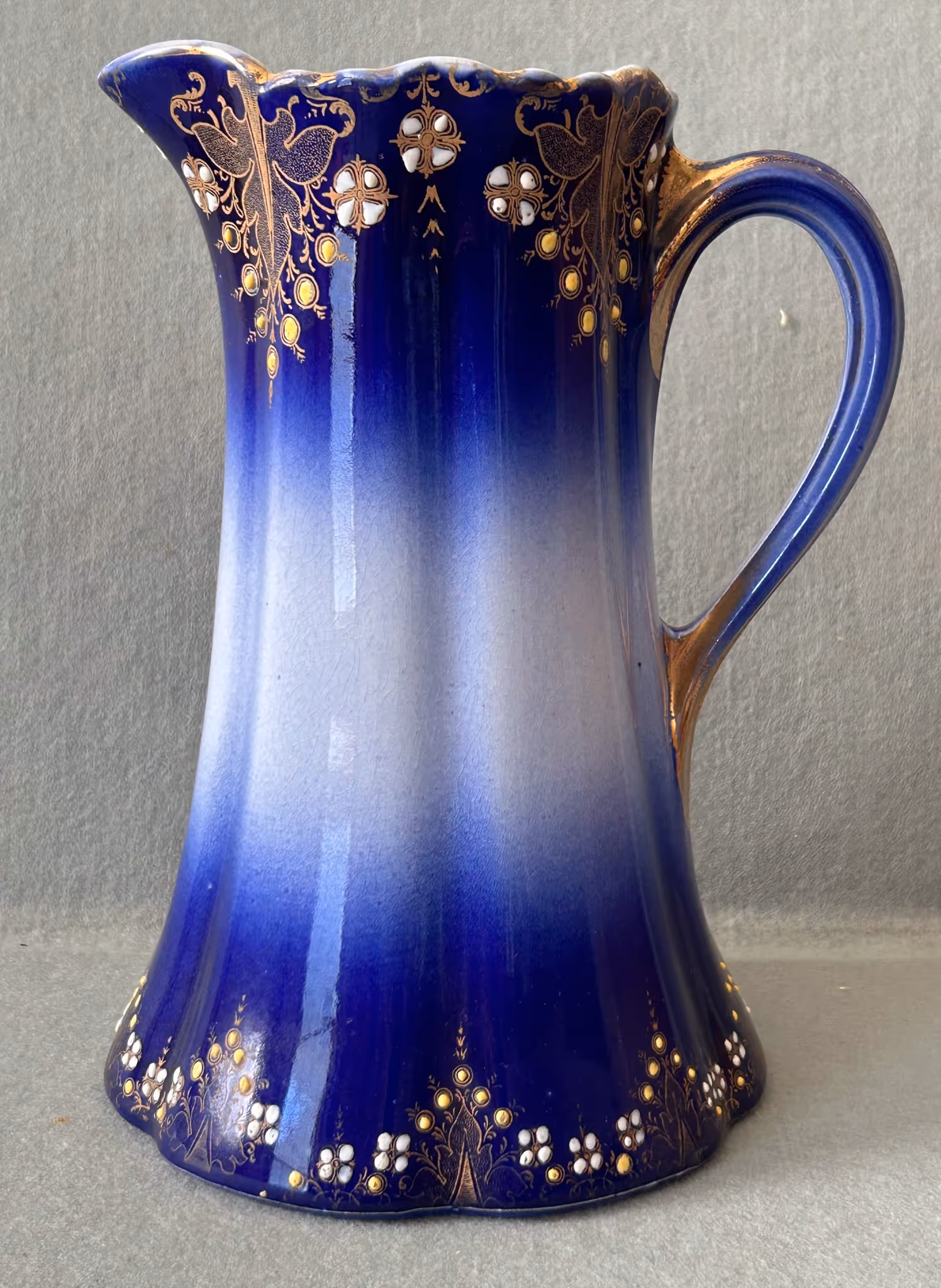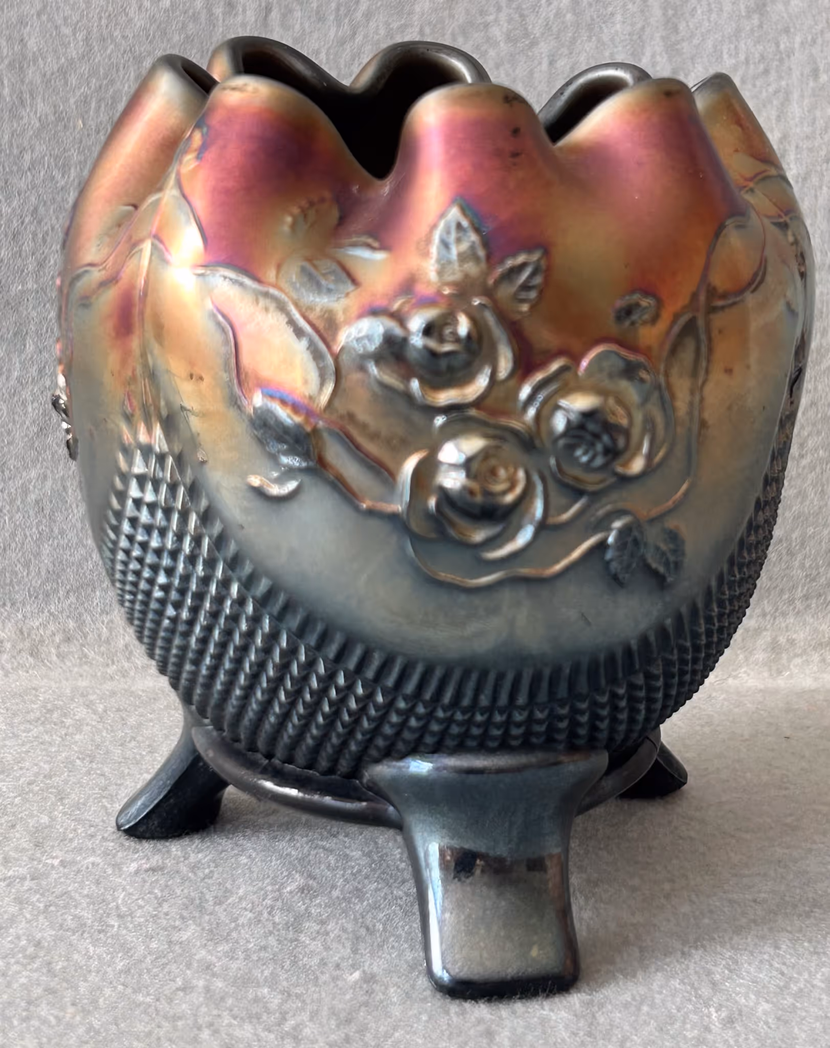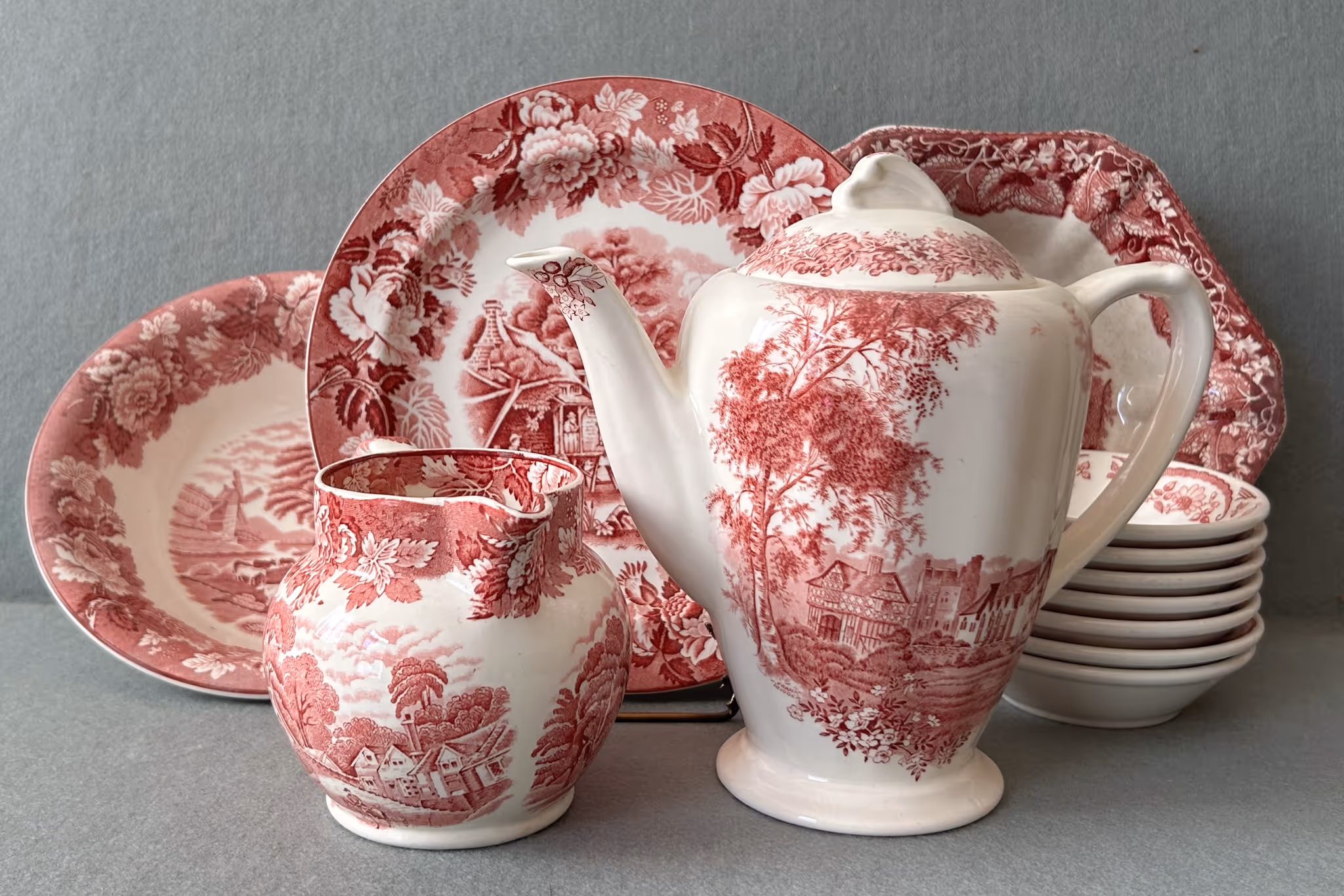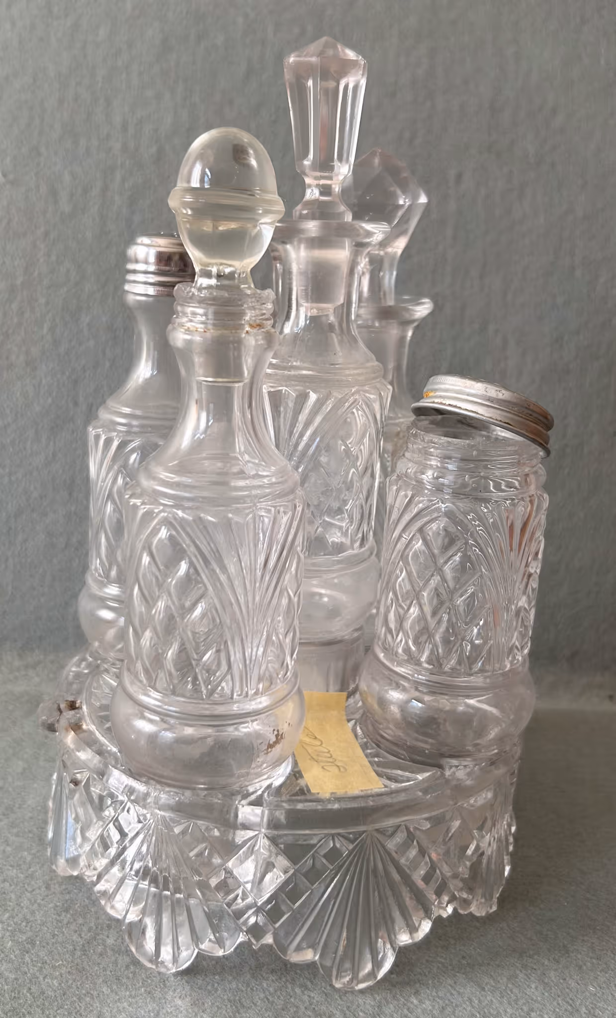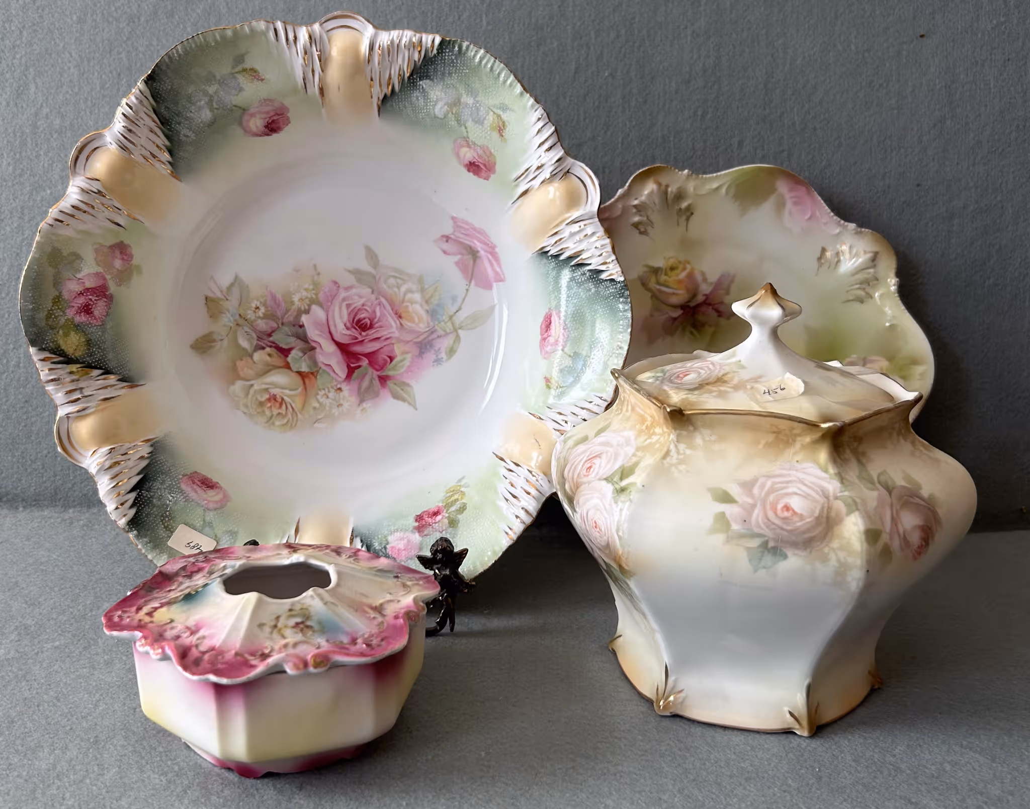 ANTIQUE GLASSWARE: Nice Woodson Flow Blue pitcher & bowl * 4Peppermint swirl cranberry opalescent tumblers * RSP dresser box * Tapestry bowl * Hp cracker jar * Limoges cake stand * Hp tankard w/ Poppies * Shaving mugs * Crown Conett bread tray * Purple Croesus toothpick * Lead crystal * Fostoria pitcher & stems (American) * Silver plate Tea service * Blue basket * Mini lamps * Shirley Temple glassware * Carnival footed Rose bowl * Canister jars *