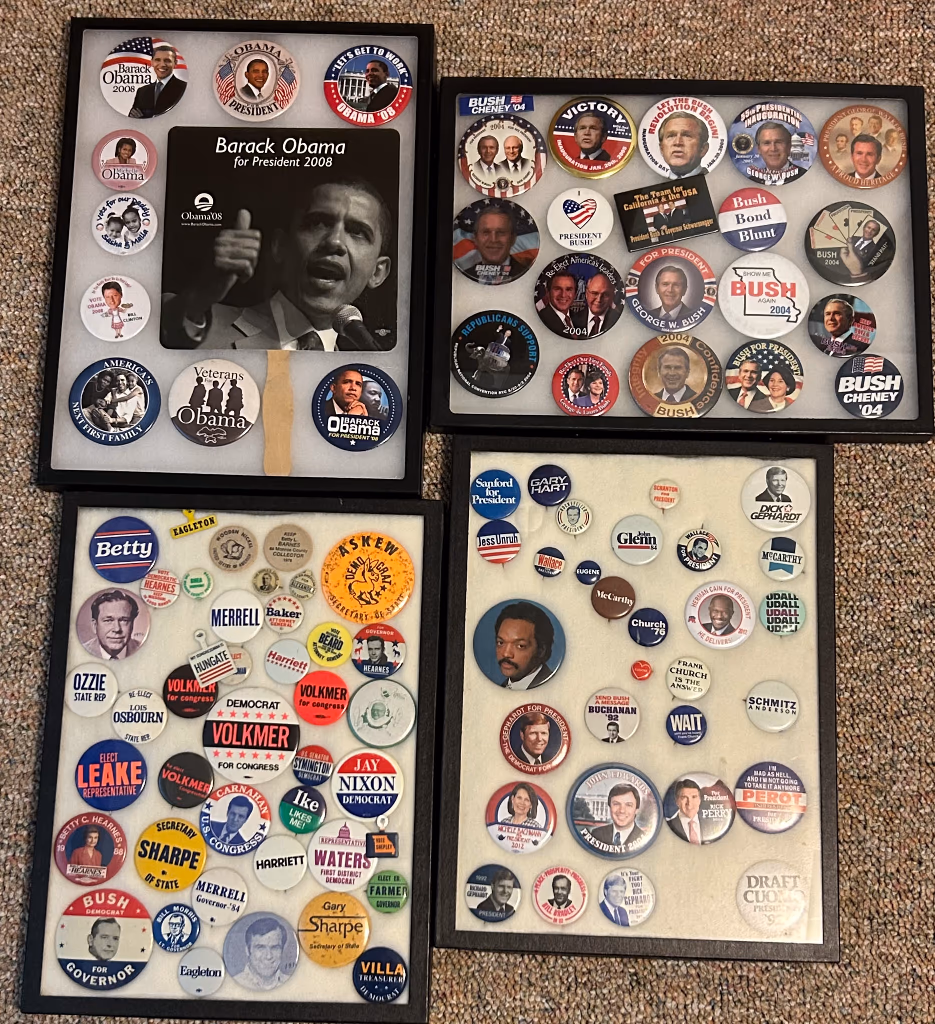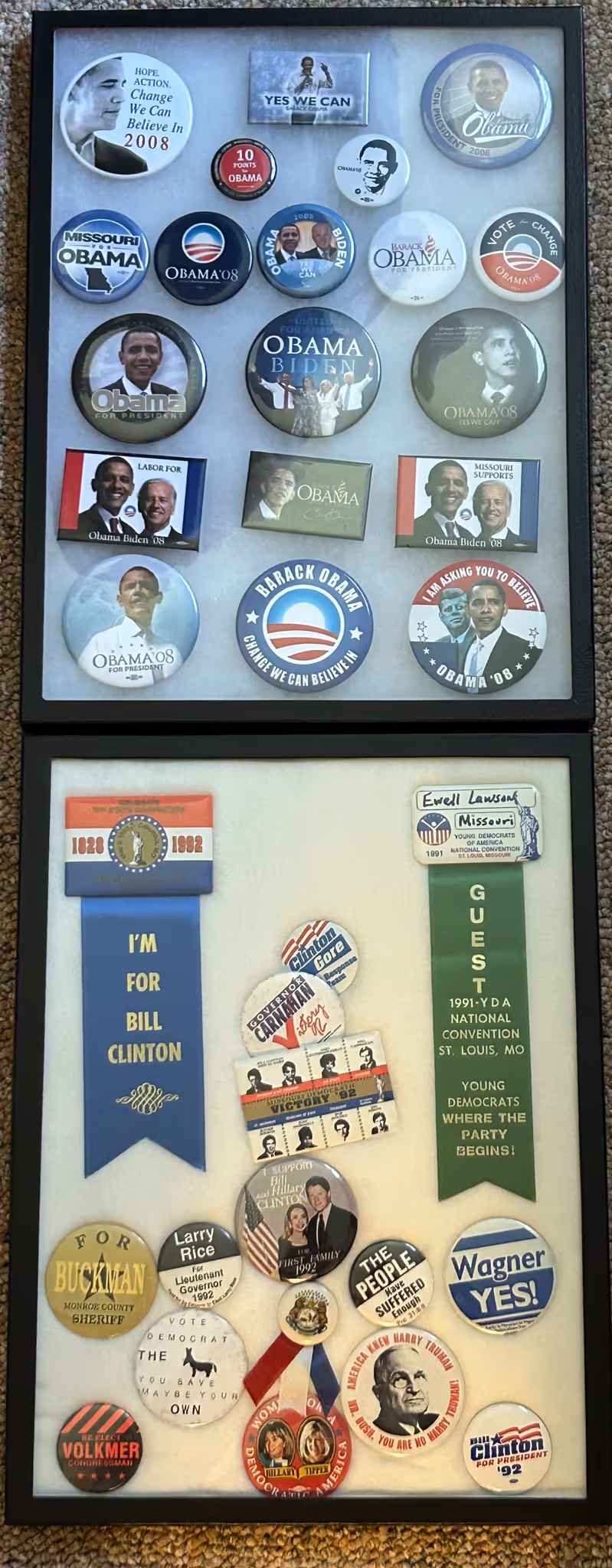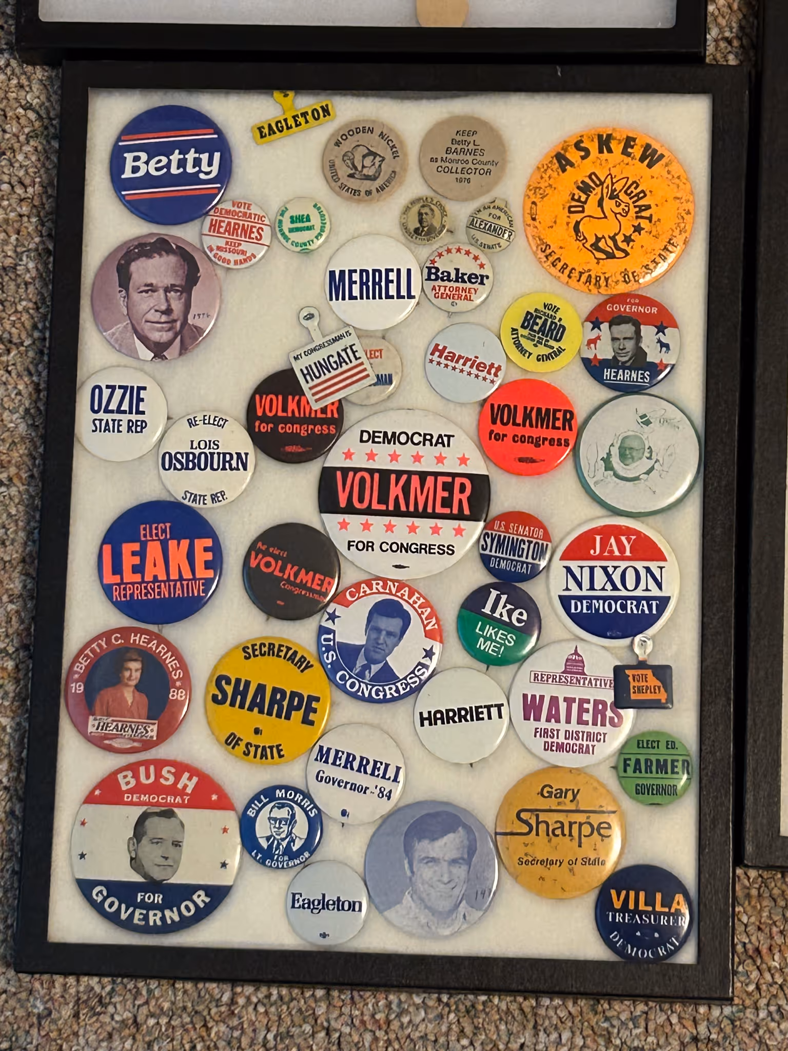 POLITICAL ITEMS & CAMPAIGN BUTTON COLLECTION: Donkey& Elephant bobble heads * Harry Truman cultured marble framed picture *100’s of campaign buttons in showcase riker mounts, McKinley, F.D.R., Truman, Eisenhower, L.B.J., Obama, Carter, Reagan, Ford, Jerry Litton, etc * 100’s of loose buttons