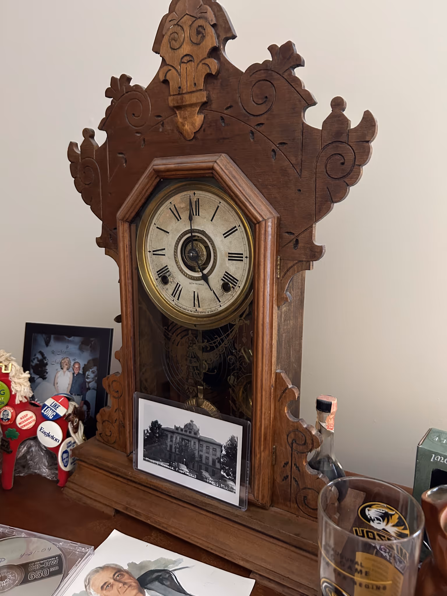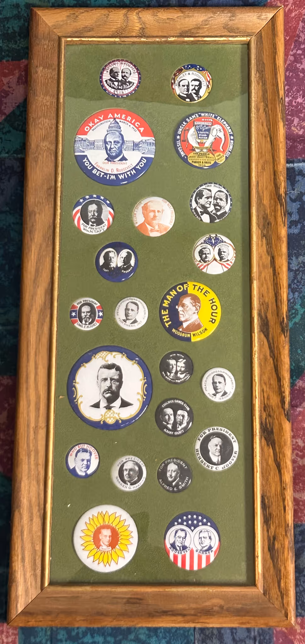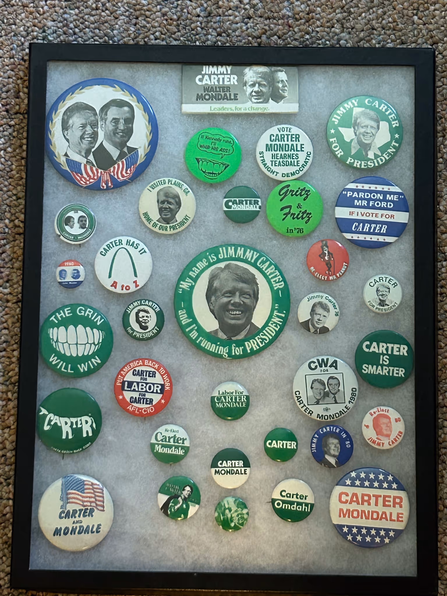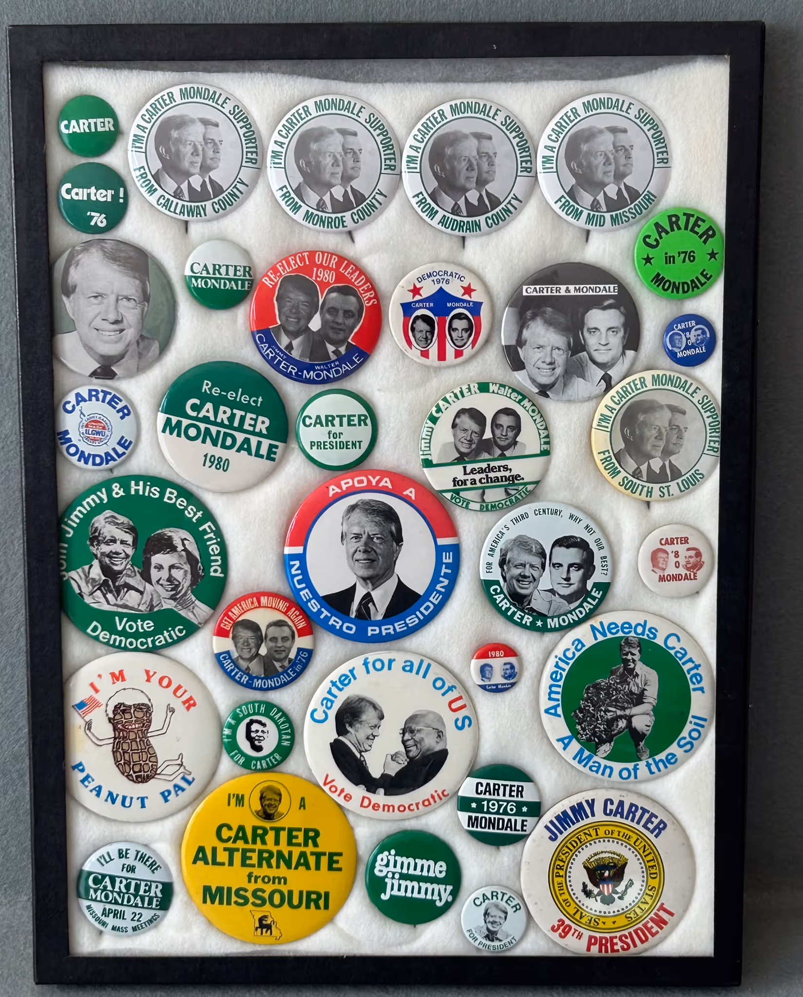 POLITICAL ITEMS & CAMPAIGN BUTTON COLLECTION: Donkey& Elephant bobble heads * Harry Truman cultured marble framed picture *100’s of campaign buttons in showcase riker mounts, McKinley, F.D.R., Truman, Eisenhower, L.B.J., Obama, Carter, Reagan, Ford, Jerry Litton, etc * 100’s of loose buttons